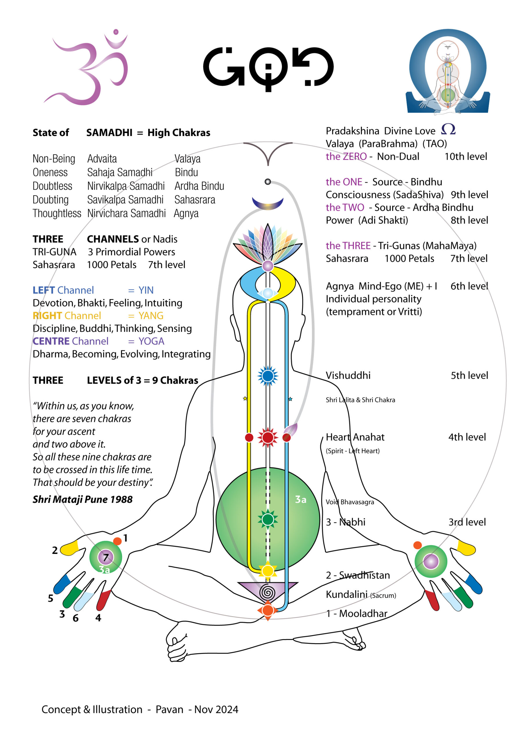 Postulation : It appears to this Sahaja Yogi that our higher Chakras have a numeric parallel, with the higher Samadhis, over time. IE Nirvichara Samadhi. Sarvikalpa Samadhi. Nirvikalpa Samadhi. Sahaja Samadhi. are four highest states in our Ascent and these states could parallel the four higher chakras as we grow, mature and establish. NB : This is ‘postulated’, put forward as a possible correlation…. It is up to you as a true Seeker and surrendered Yogi to realise if this is true for you.